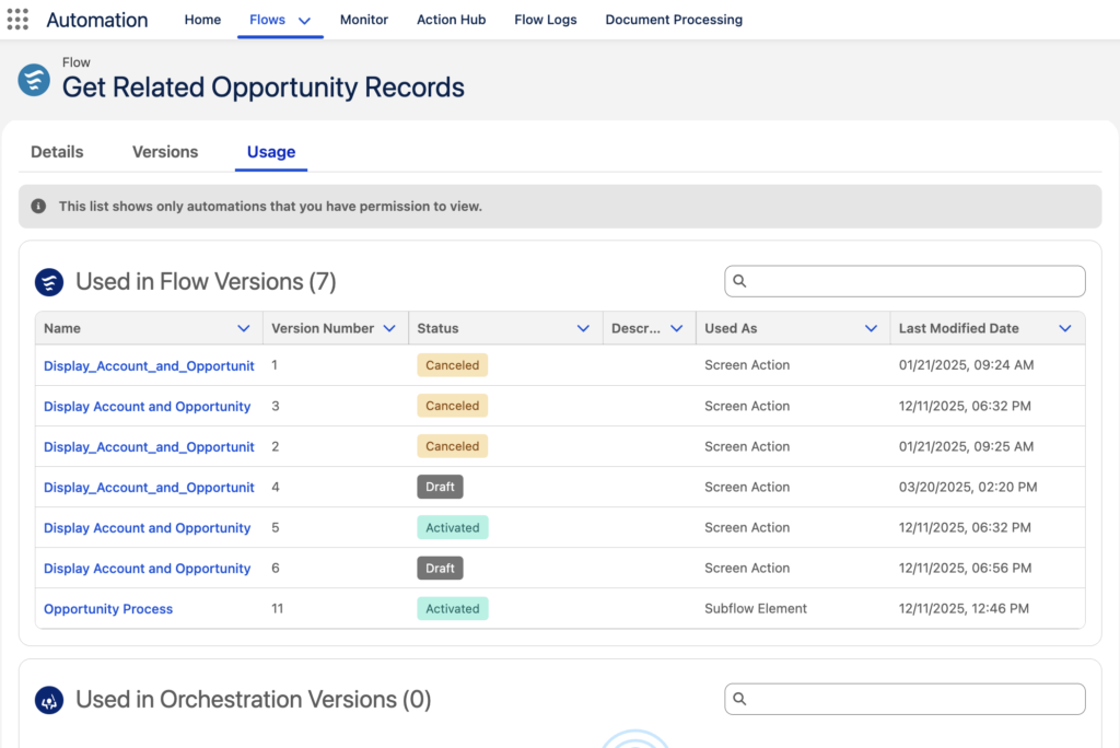 When you open a Flow record in the Automation app, you will see a new Usage tab. It shows bidirectional relationships including which automations use that Flow and which automation versions depend on it.
