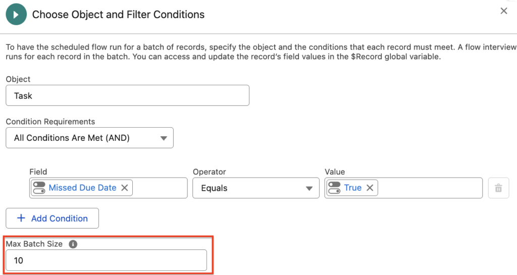 You can now set the maximum batch size in schedule-triggered flows. The default batch size is 200, but you can choose a smaller value when needed. For example, if the flow needs to process 7 records and the maximum batch size is set to 2, Salesforce will process them in 4 batches.
